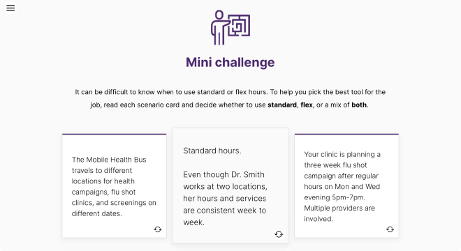 The scenario flipcards in the “Choose whether to use standard or flex hours” lesson are one my favourite elements in this course. This choice came up repeatedly in stakeholder interviews as the most difficult aspect of the workflow. The system steps were straightforward and already well documented. It was the decision making behind them that was daunting.